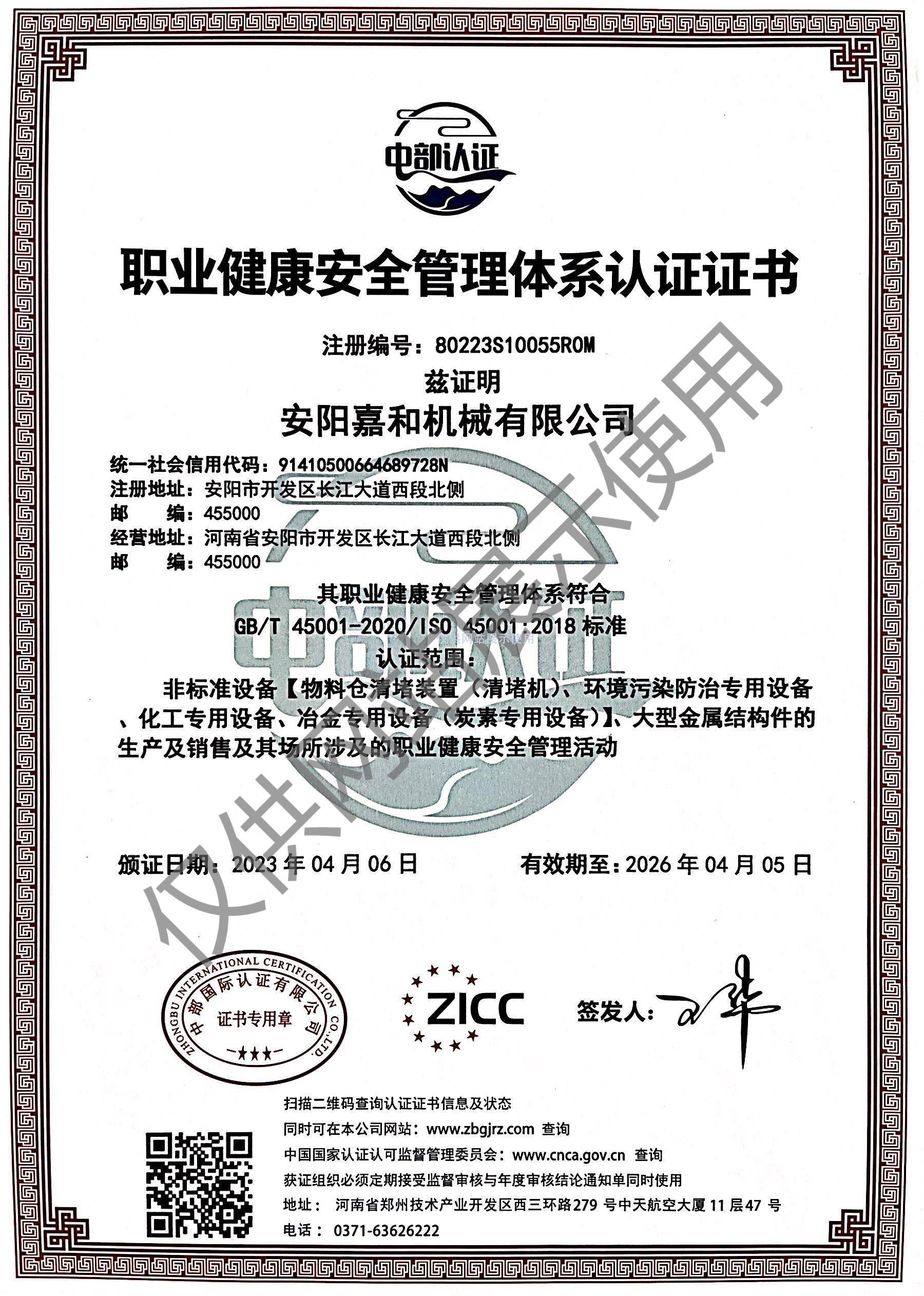 職業健康安全管理體系認證證書